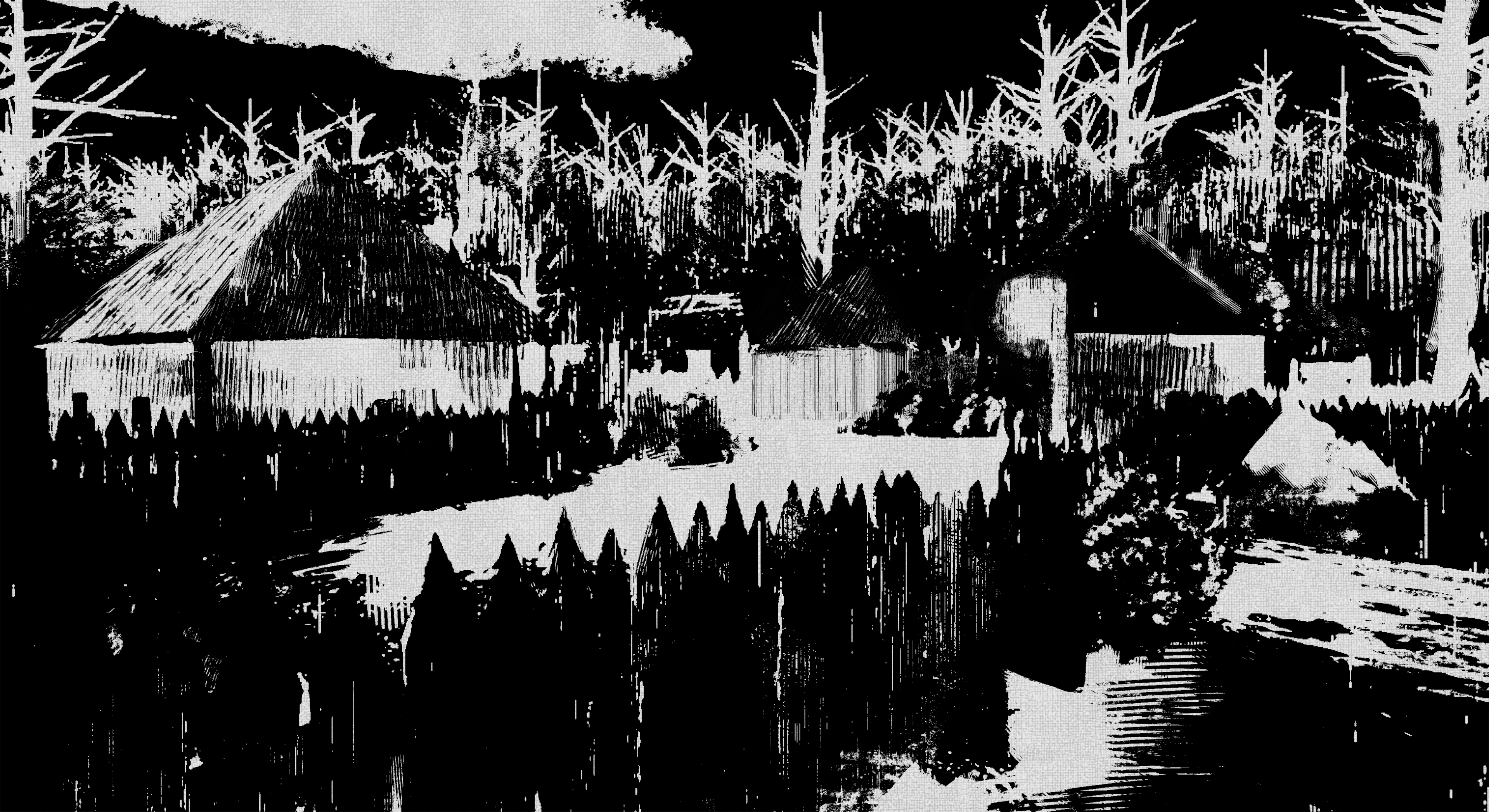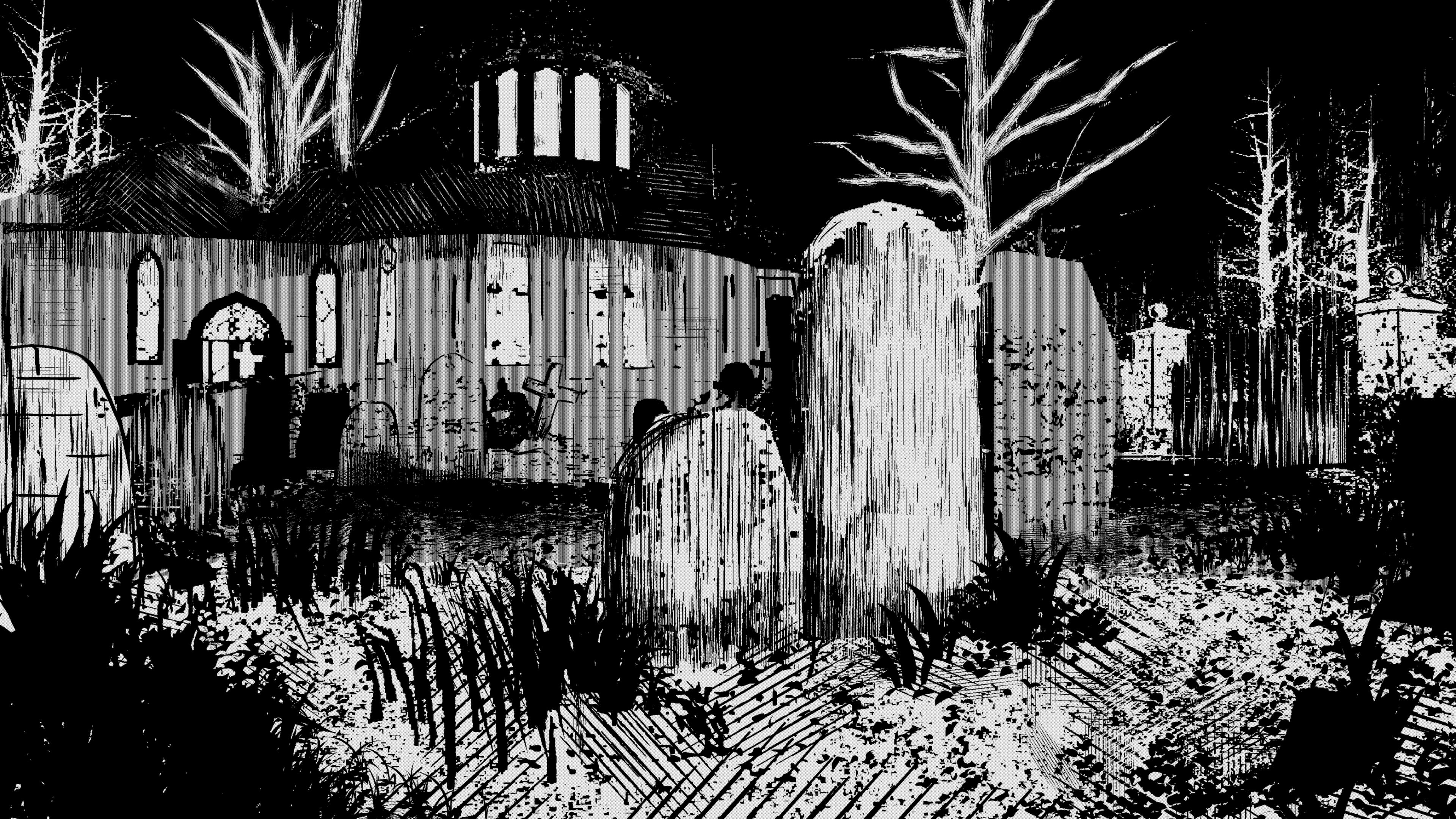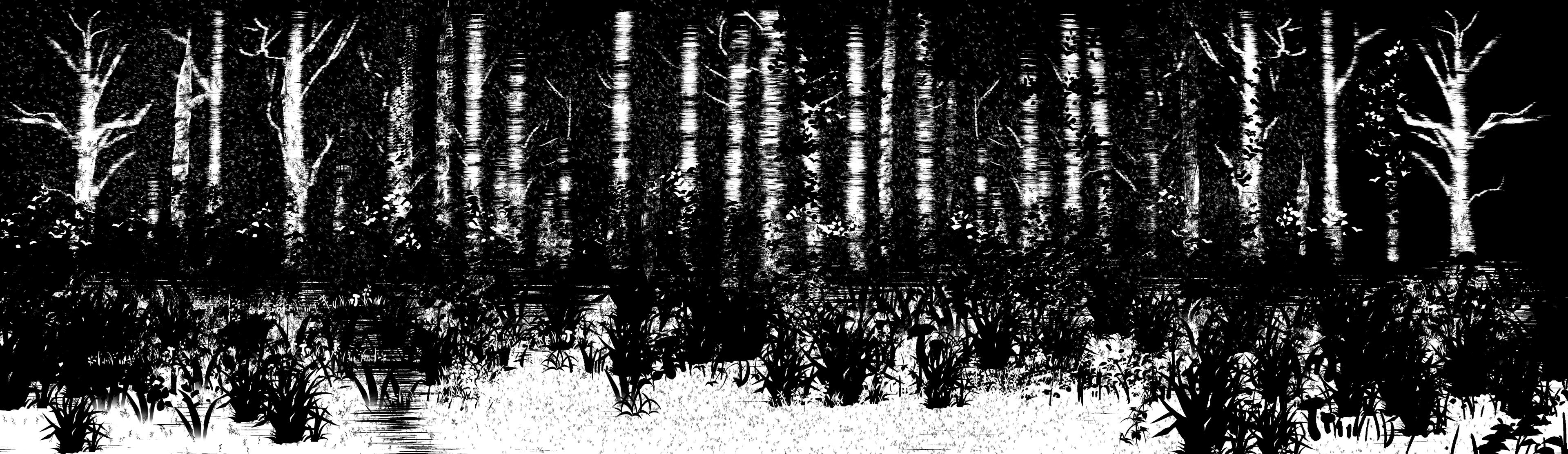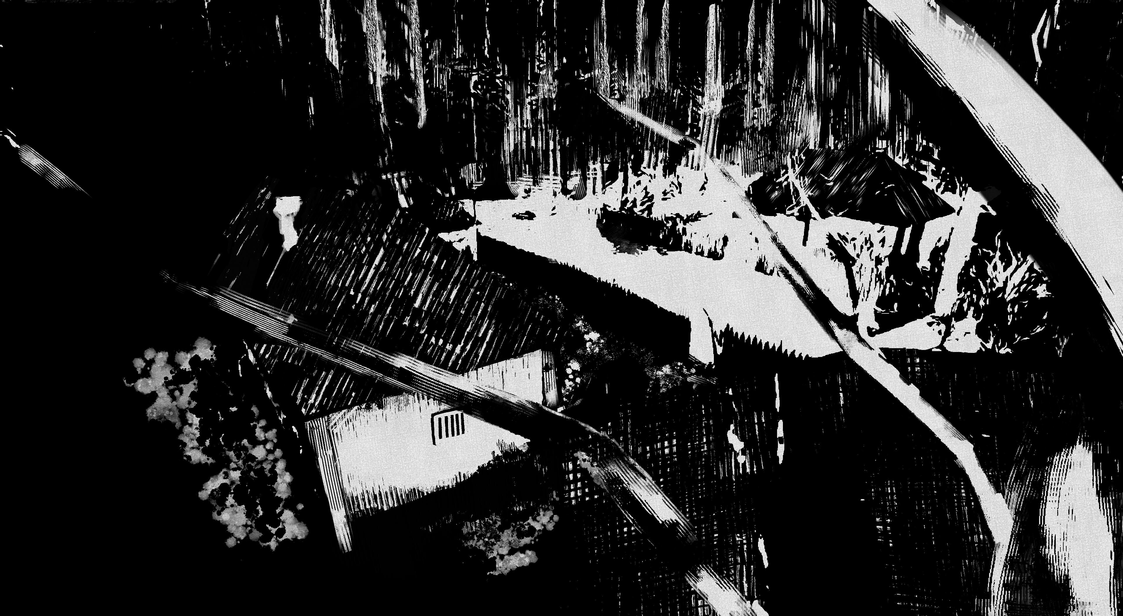 Being that the whole project would be black and white, I asked for screenshots from the current build and applied binarization. After that I painted over, textured, and strengthen values + forms. I got the idea while scouring manga panels for ideas on how to create depth with only two values.